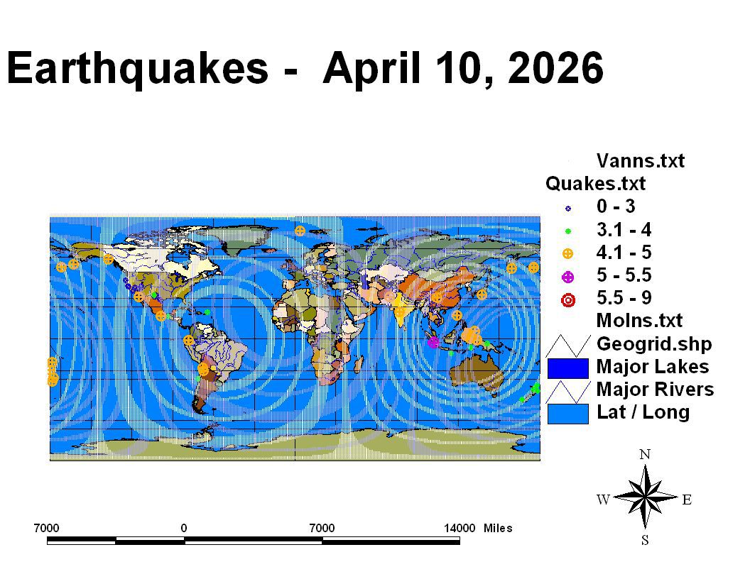 Following is a listing of epicenters where the most likely light to moderate earthquakes are expected during the period April 11, 2026 through April 20, 2026. While other earthquakes may occur during this period they are considered less probable than the ones listed. Please consult the seismic watches for areas where large earthquakes are considered most likely to occur during this period. This list includes expected variations on the general background seismic activity especially where larger events are expected during the time window. Large events are not generally forecast in these 10-day lists. These are for the use of watching specific regions for upcoming activity. They are output to the nearest one degree of latitude and longitude and are expected in general to be several days in error. When indications suggest a larger event is likely a seismic watch will be published in the main daily summary.