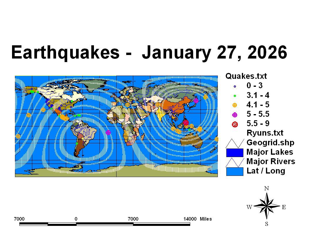 Following is a listing of epicenters where the most likely light to moderate earthquakes are expected during the period January 21, 2026 through January 31, 2026. While other earthquakes may occur during this period they are considered less probable than the ones listed. Please consult the seismic watches for areas where large earthquakes are considered most likely to occur during this period. This list includes expected variations on the general background seismic activity especially where larger events are expected during the time window. Large events are not generally forecast in these 10-day lists. These are for the use of watching specific regions for upcoming activity. They are output to the nearest one degree of latitude and longitude and are expected in general to be several days in error. When indications suggest a larger event is likely a seismic watch will be published in the main daily summary.